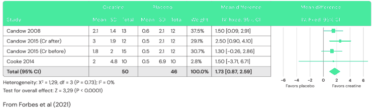 A meta-analysis by Forbes et al. examined the effects of creatine and found increases in lean muscle mass, as well as a positive impact on preserving it during aging. In an updated 2024 review, Forbes and Candow incorporated newer studies and confirmed these findings. Specifically, they found that creatine, when combined with resistance training, leads to increased muscle mass. The newer review also highlighted possible benefits to bone geometry — which may reduce fracture risk.